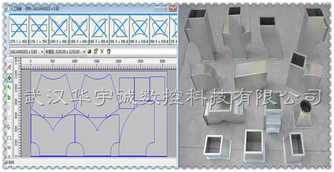 加工范圍:0.2-6.0mm任意材料鋼板的切割成型!可切割各種異形件,電腦直接畫圖,導(dǎo)出加工程序,批量高速切割,效果好,精度高,不掛渣!配合專用的風(fēng)管展開軟件,自動(dòng)生成圖紙、導(dǎo)出加工程序。操作人員所需要做的就是在軟件中選擇所需要的風(fēng)管樣式,輸入所需要的尺寸,然后調(diào)出加工程序進(jìn)行切割就可以了。既方便快捷、又精確實(shí)用。